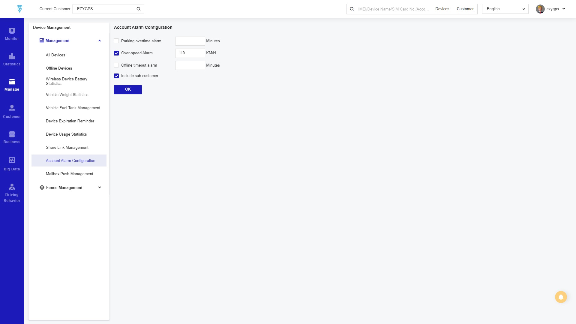 The Alarm Setting page is where alarms are set on a broad basics for every device in the account. Though the sub customer groups can be included or excluded. The three alarm that can be set are Parking overtime alarm, Over-speed alarm, and Offline timeout Alarm.