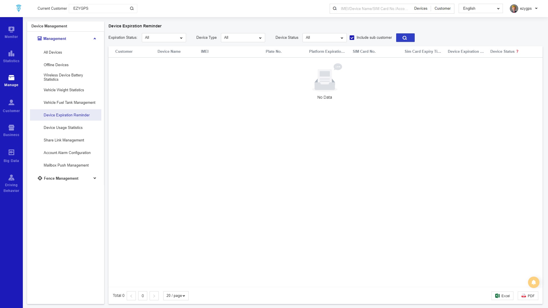 The Device Expiration Reminder contains the expired devices and SIM card, and Platform expiration time in the account.