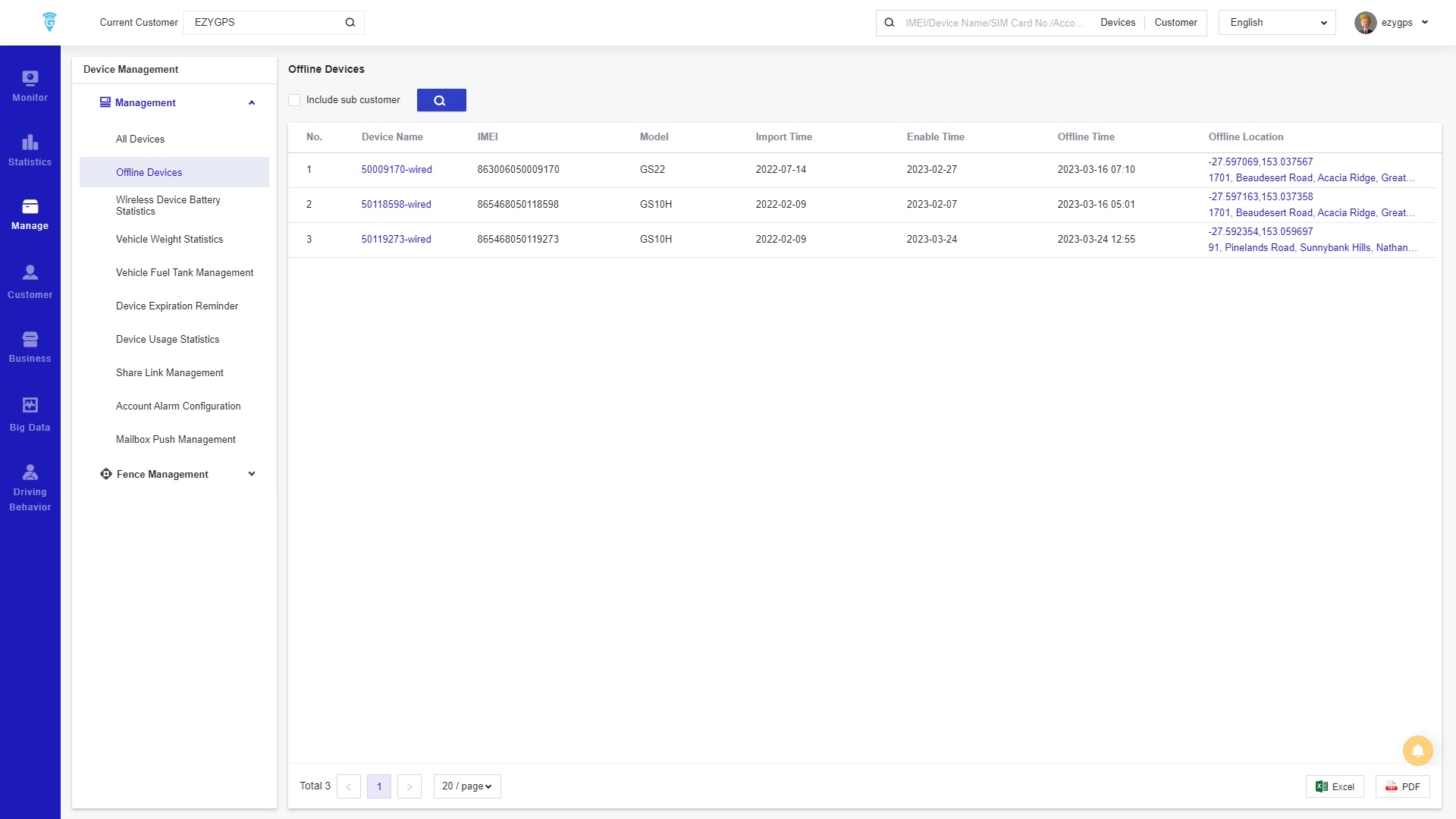 The page displays the activation time, offline time and offline address which is helpful to keep track of how old the device is and assists EZY GPS when trouble shooting.