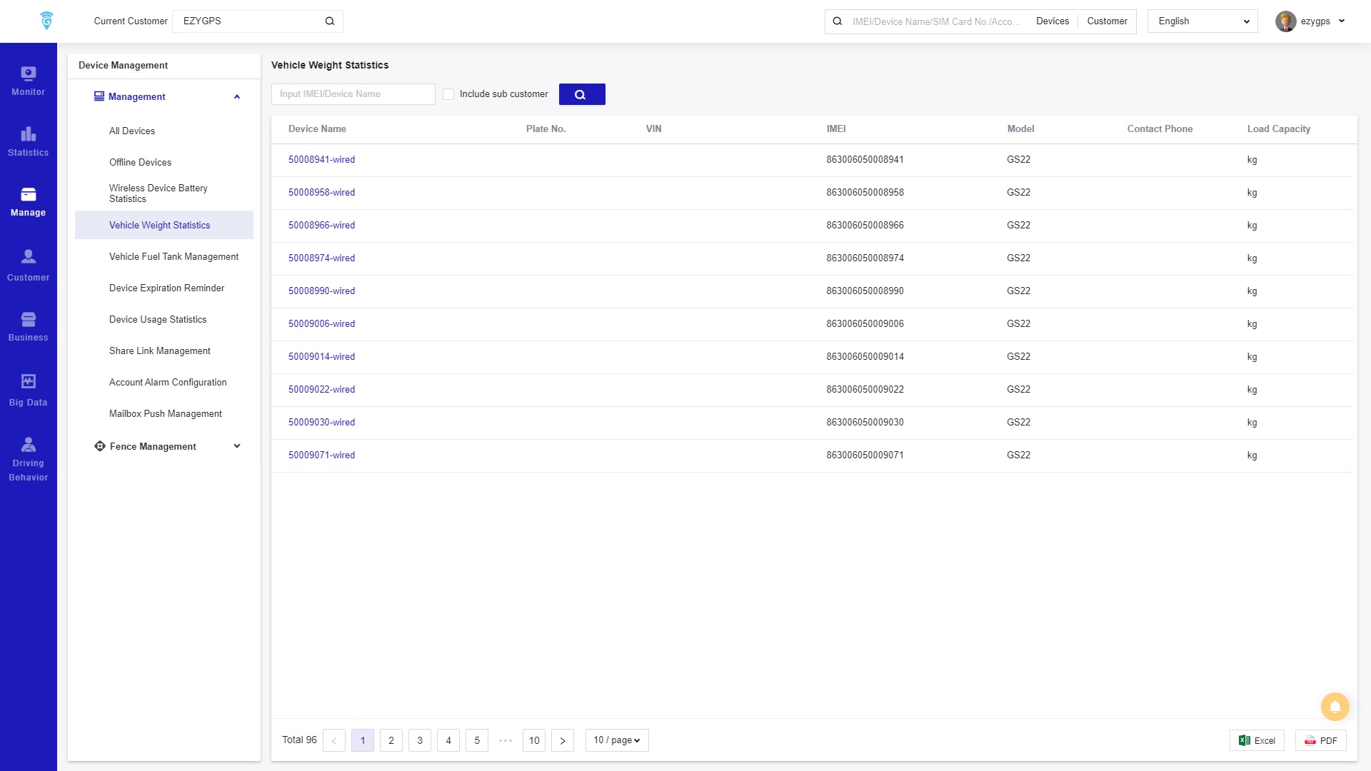 The platform page Vehicle Weight Statistics calculates the load capacity of the vehicle through the load sensor bound to the device. View the load capacity of all vehicles on the account or just an individual one by entering in the device name or number in the search bar.