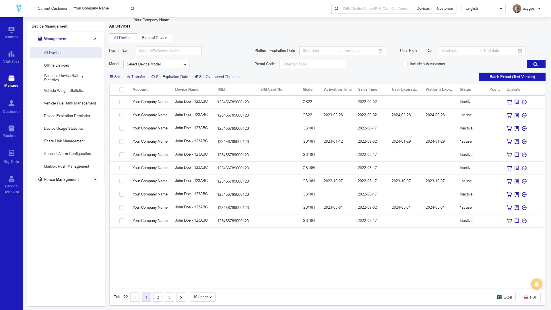 All Devices is located in the Management page. This page displays the management information of all devices, as shown below.