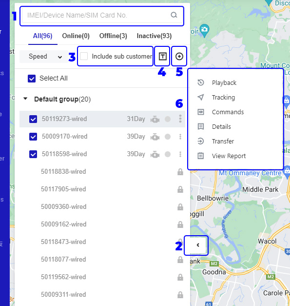 - Device Search Bar: Enter either the IMEI, Device Number, Device Name, or Sim Card Number in the search bar and click the vehicle that appears below to view the location and details of the device.